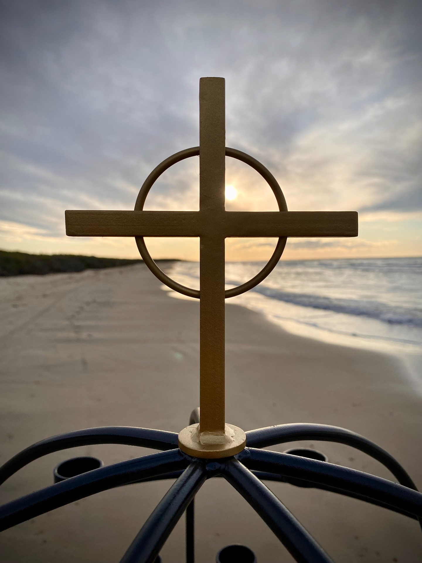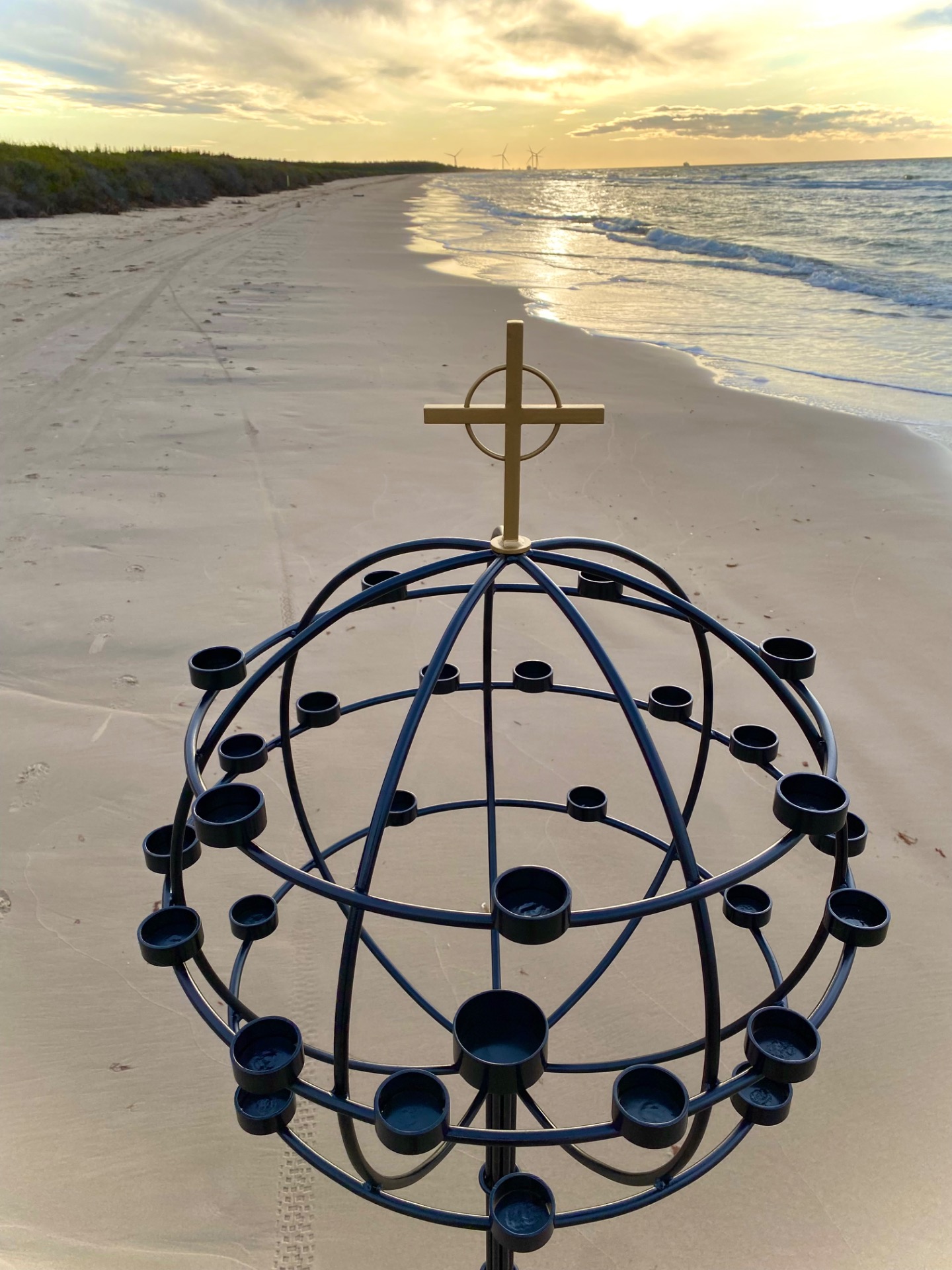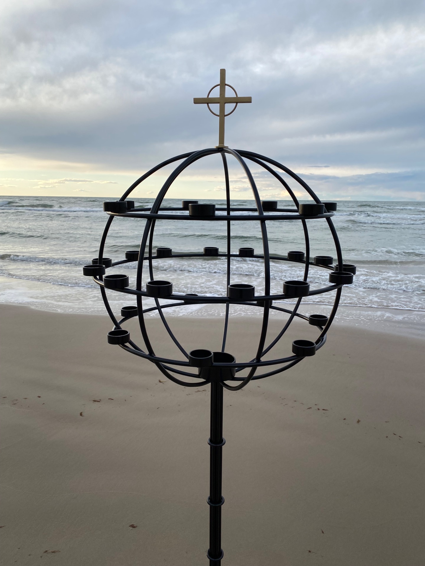 Smedejerns lysglobe i massivt rundstål til 28 stk. fyrfadslys som er sort malet og med kors i toppen.