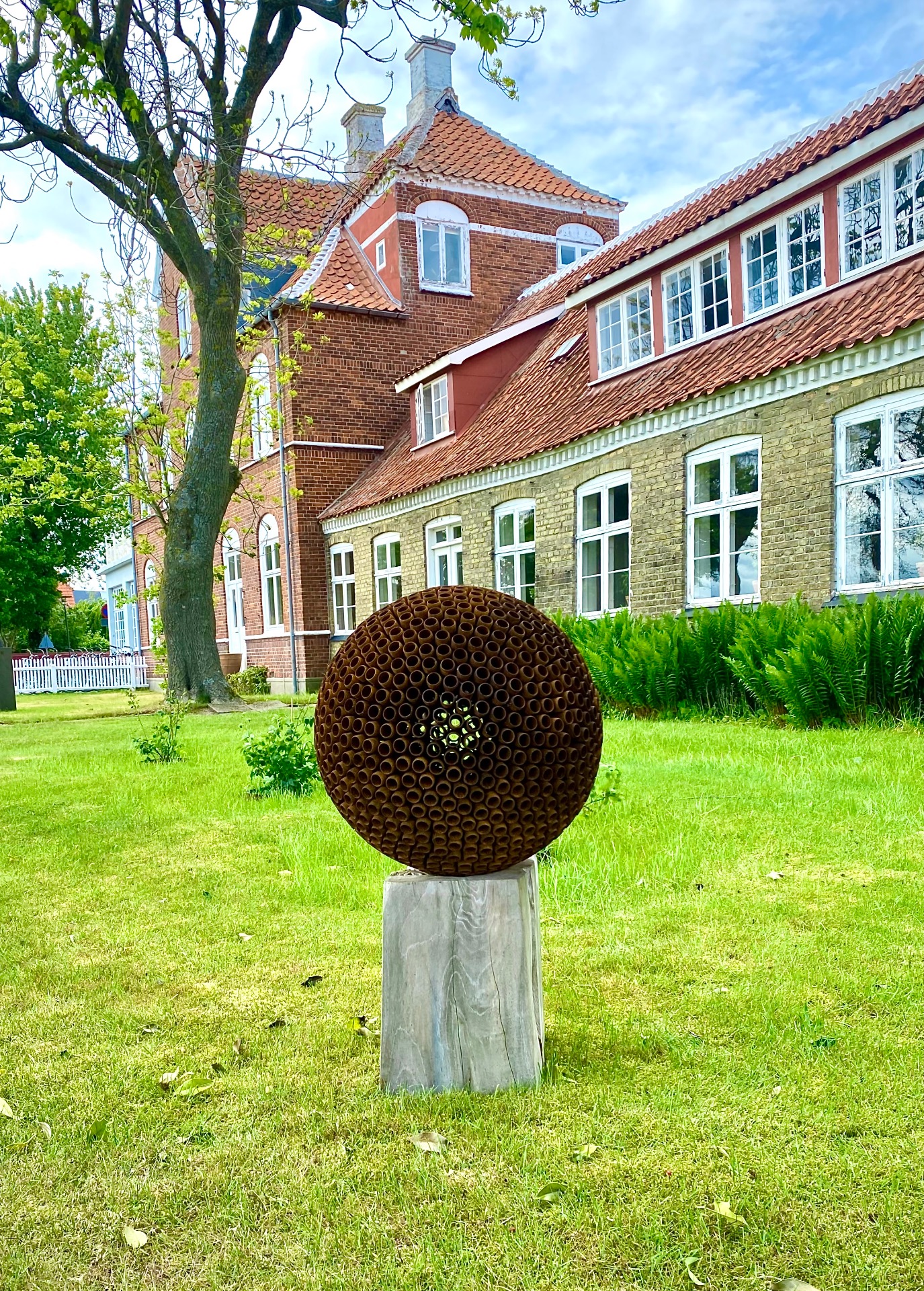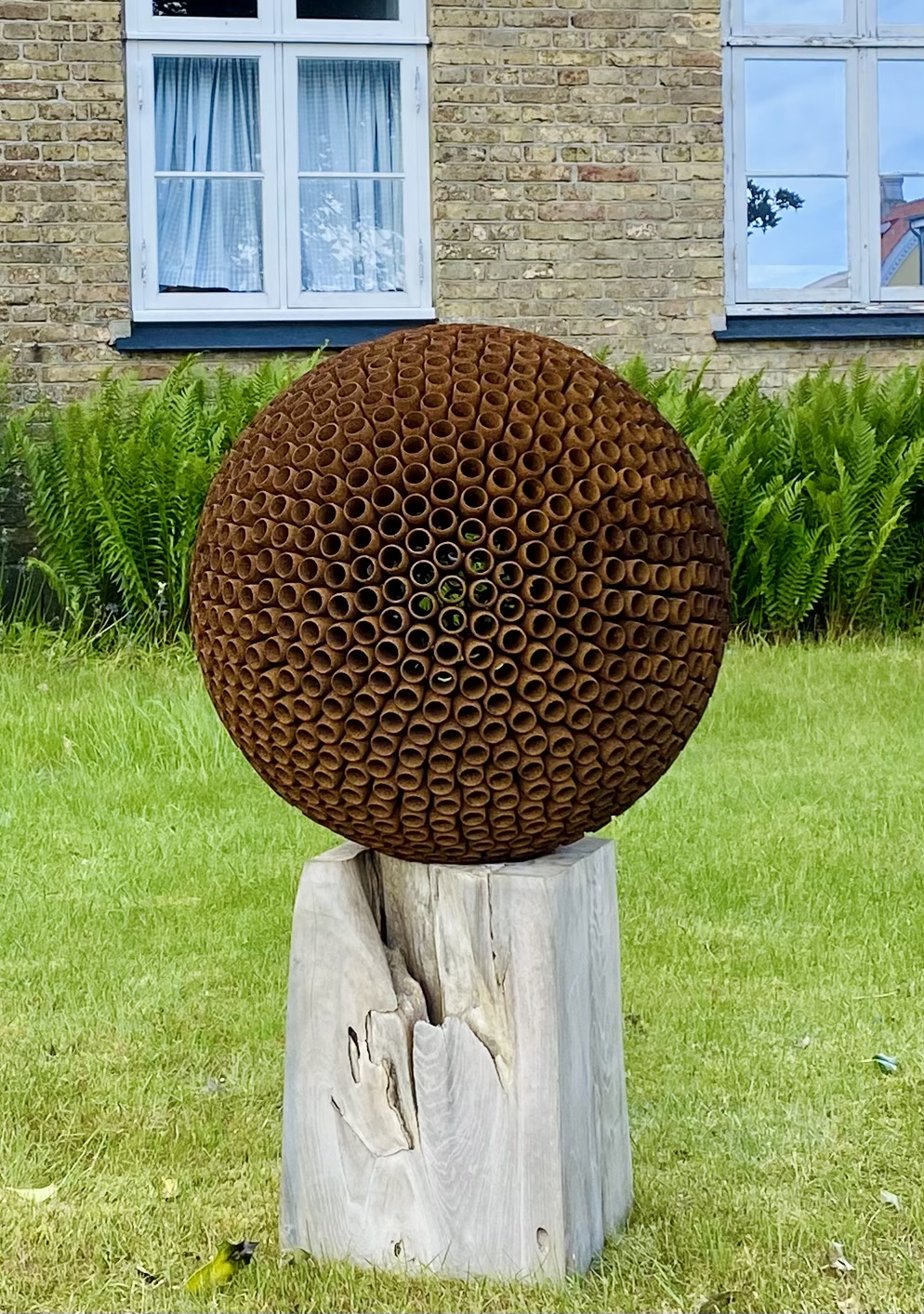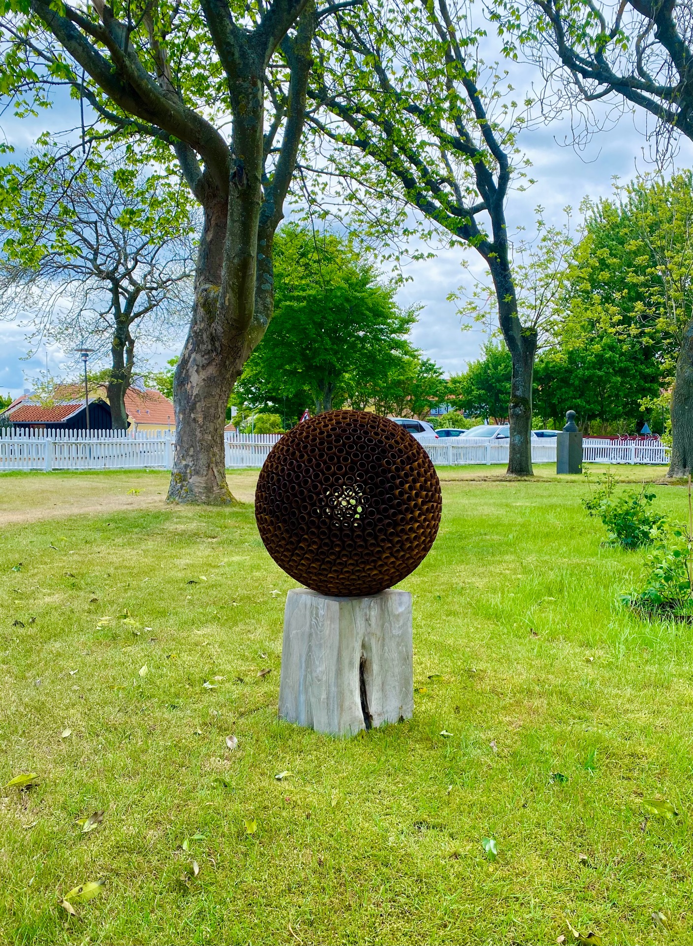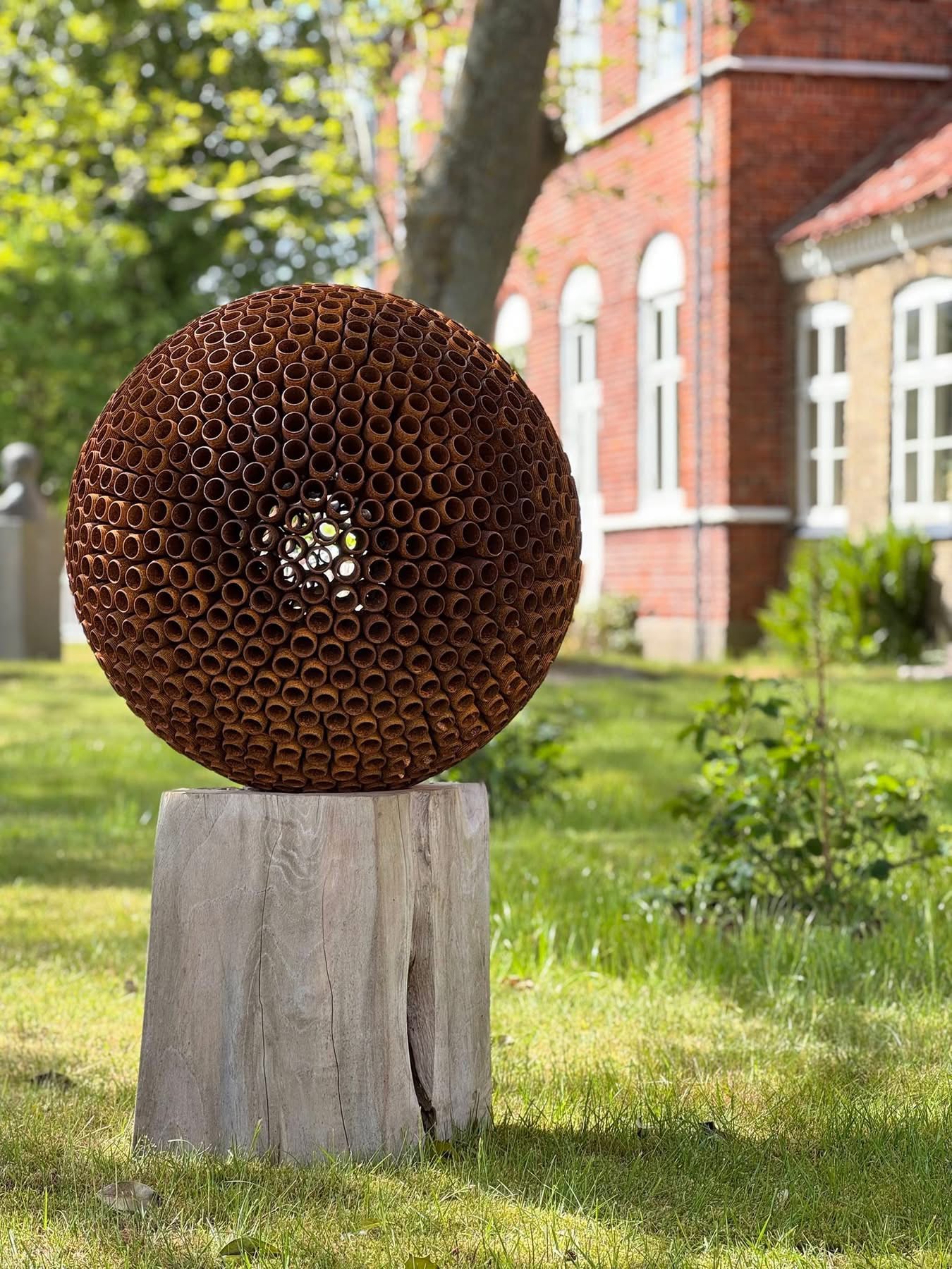 Round In Circles skulpturen ø56cm på flot teak sokkel ca. 30x30xH40cm
